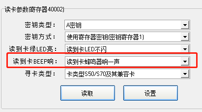 選擇蜂鳴器響一聲,如果僅僅讀取卡号,則每次讀到卡号後,蜂鳴器會響一聲, 如果選擇自動讀取數據,則讀取數據成功後響一聲。