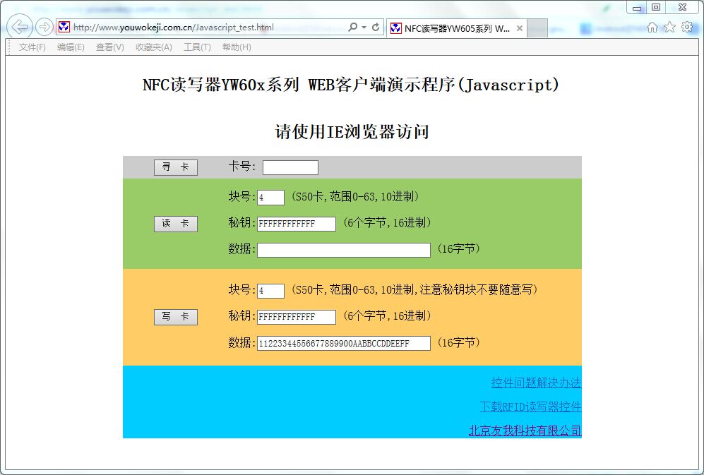 基於ActiveX技術的ocx控件是實現網頁上讀寫IC卡的一個比較不錯的方法,因爲ocx是com組件,通過其發布的接口,IE可以實現所有的功能。ActiveX不僅能适應大部分編程語言,做到與編程語言無關,還能将IC卡讀卡器集成到web中,使得在BS結構中可以在web客戶端輕松的調用IC卡讀卡器,極大地改善瞭(le)用戶體驗。 隻要爲IC卡讀卡器或者NFC讀寫器發布相應的ActiveX控件就可以實現在WEB客戶端使用IC卡讀卡器瞭(le),爲此友我科技發布瞭(le)yw60x.ocx這個IC卡讀卡器控件,並(bìng)且分爲瞭(le)32位和64位版本,分别對應32位IE和64位的IE。控件yw60x.ocx支持的讀卡器有SDT-HA,YW-605HA,YW-607等。但是這種技術方案的最大缺點就是隻支持IE浏覽器,不支持其他的浏覽器。