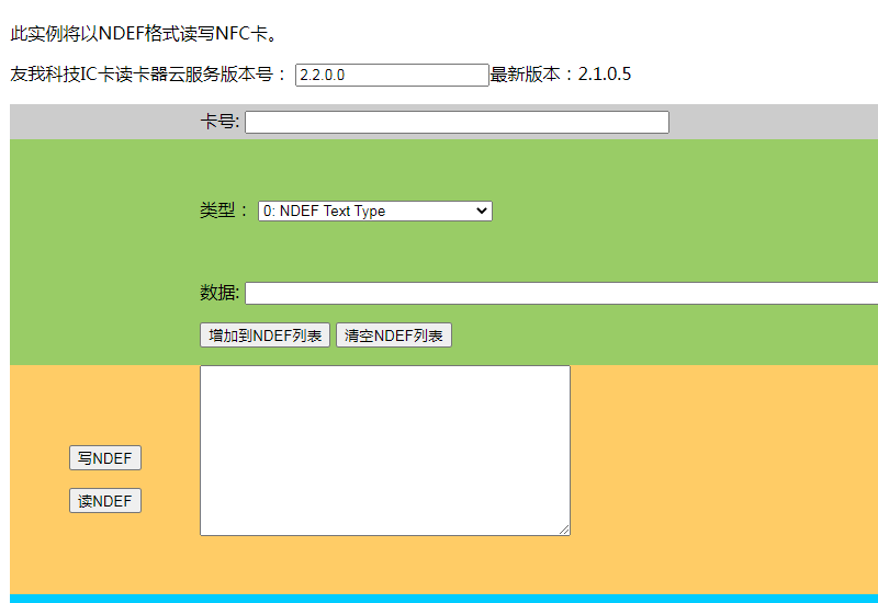 NDEF格式是NFC論壇定義的一種标準數據交換格式,有瞭這種數據格式,各種NFC設備就可以直接讀取或者寫入所需要的數據,而不需要事先做約定。友我科技全系列NFC讀寫器都支持NDEF格式。